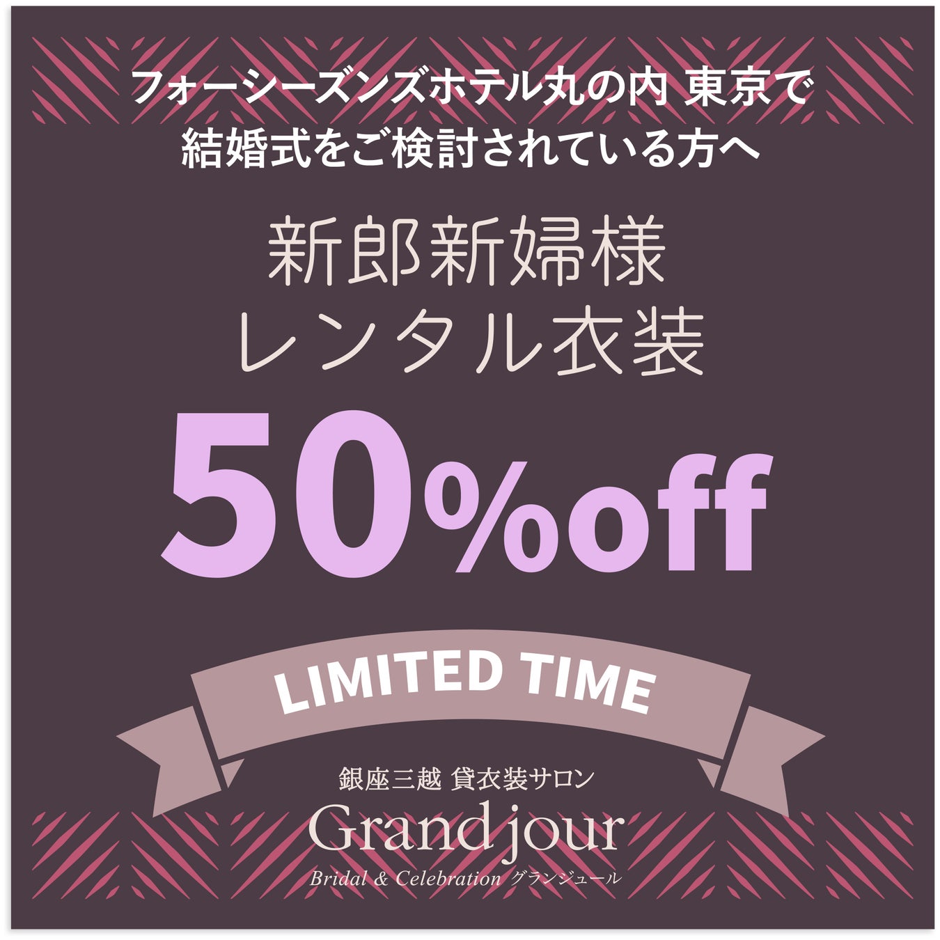 フェア期間中限定で会場にてお配りしている、50%OFFのマークが入ったチラシをご持参のうえ、衣裳をご成約いただいたお客様には、新郎新婦様のレンタル衣裳代が洋装・和装問わず、どれでも半額に。ご親族のレンタル衣裳は3割引になるほか、さらに2着以上のご成約をいただくと配送料無料にて承ります。