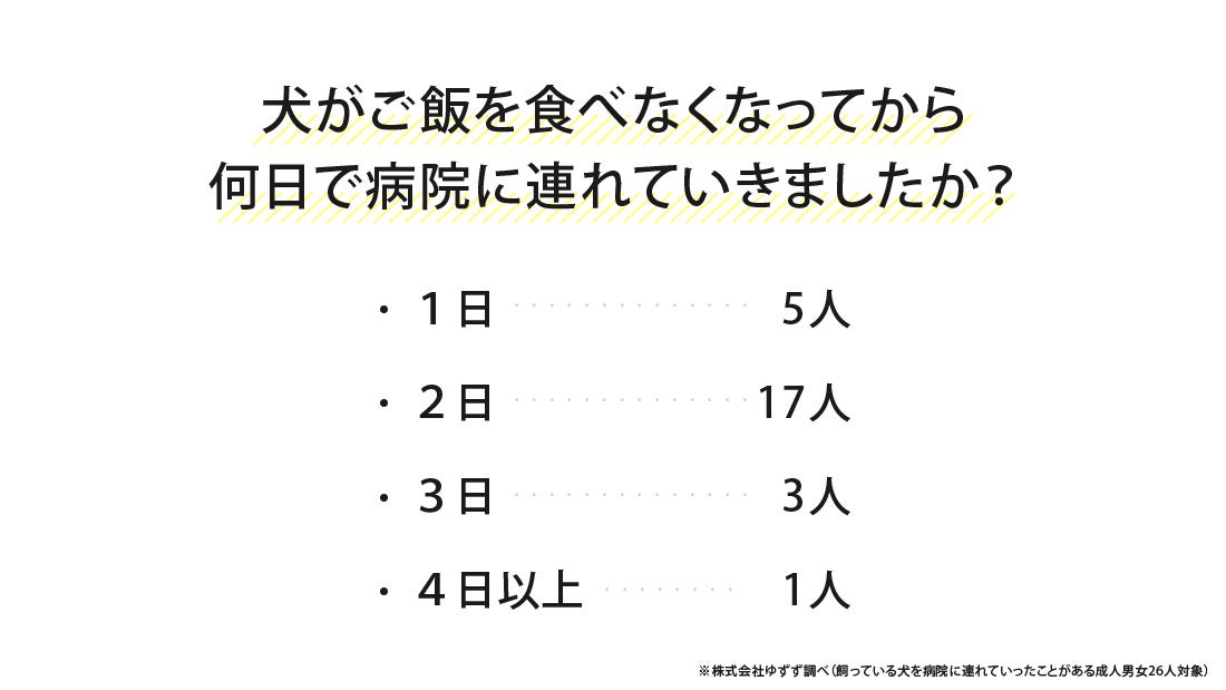 こちらも病院を受診した飼い主に「ご飯を食べなくなってから何日で病院に連れて行ったか」をアンケート調査したところ、もっとも多かったのは「2日」でした。
