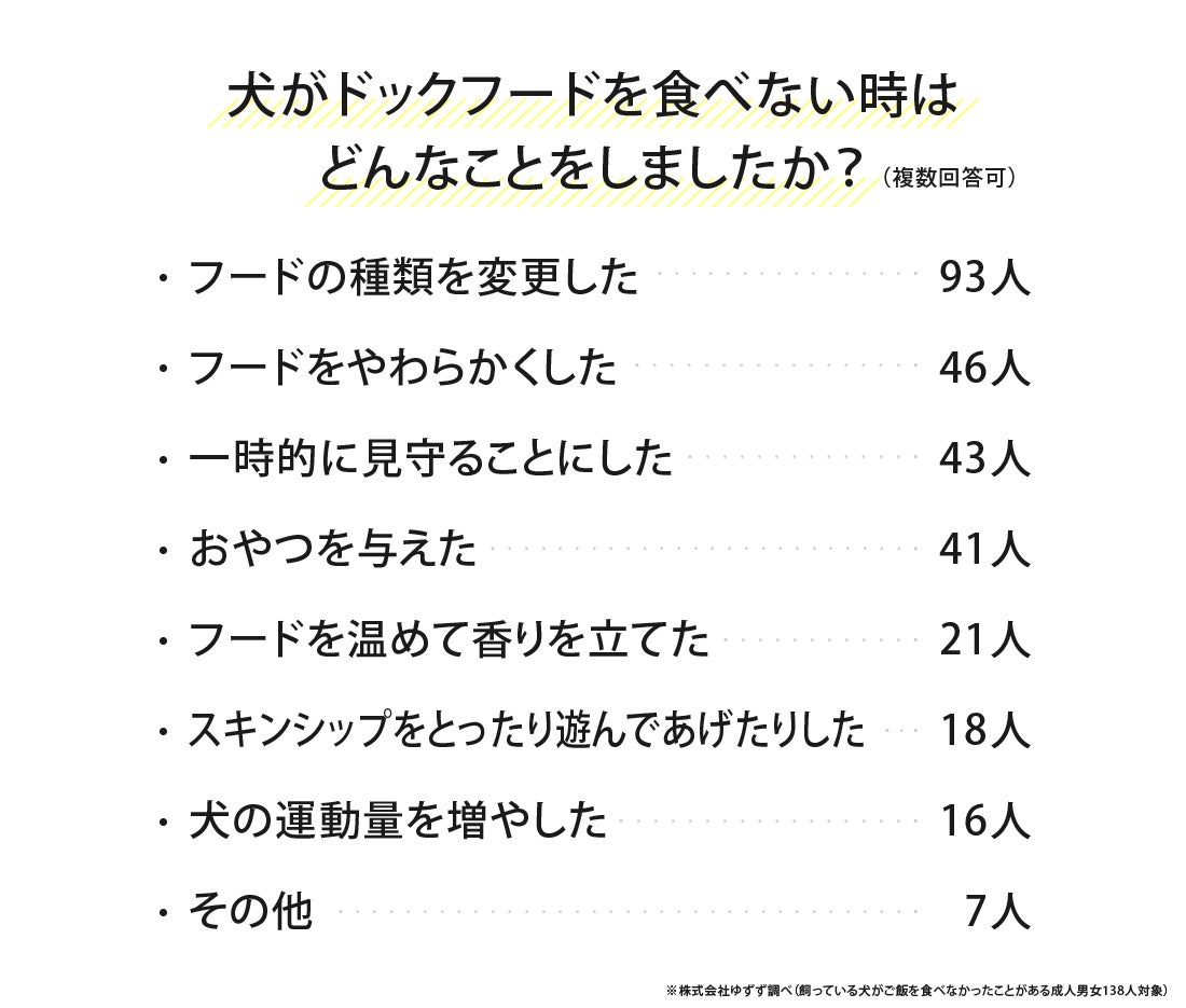こちらも犬を飼っている成人男女に「犬がドッグフードを食べない時の対処法」についてアンケート調査したところ、最も多かった回答は「フードの種類を変更した(93人)」でした。