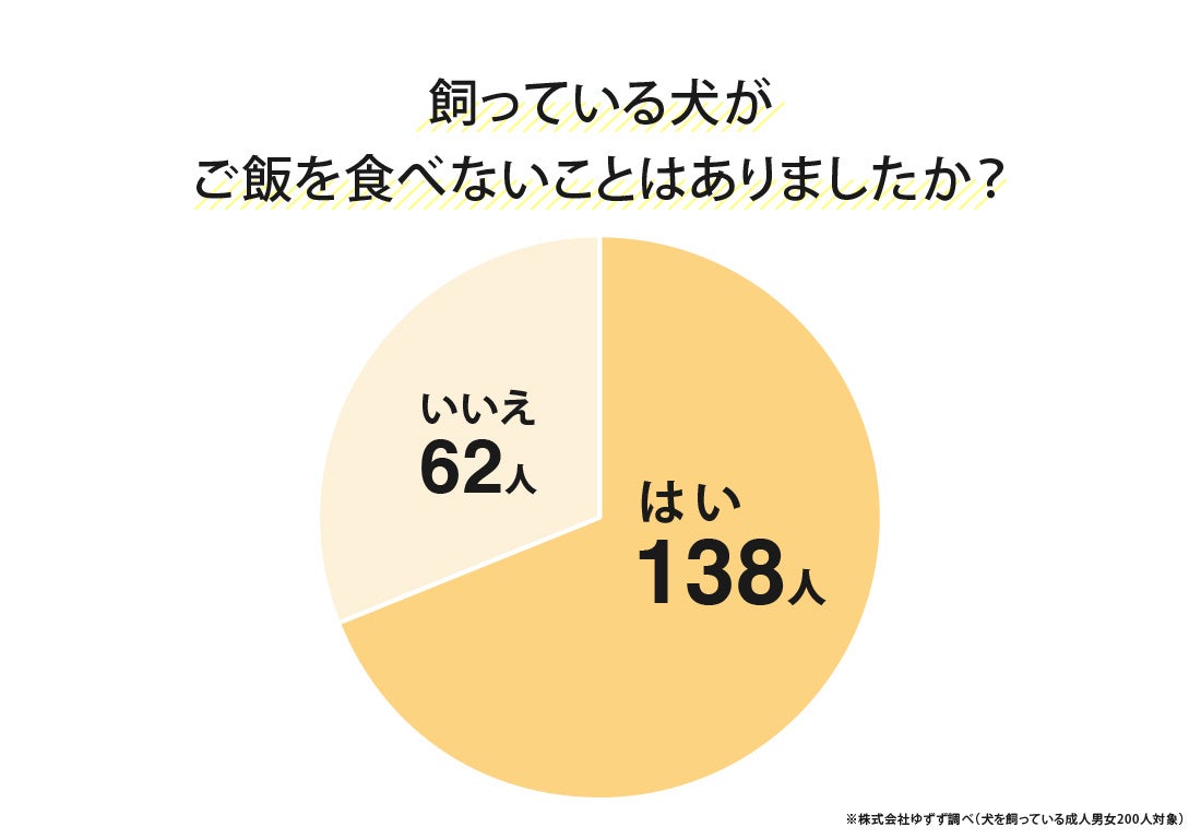 犬を飼っている成人男女200人にアンケート調査したところ、7割近くの人が「飼っている犬がご飯を食べないことがある」と回答しました。