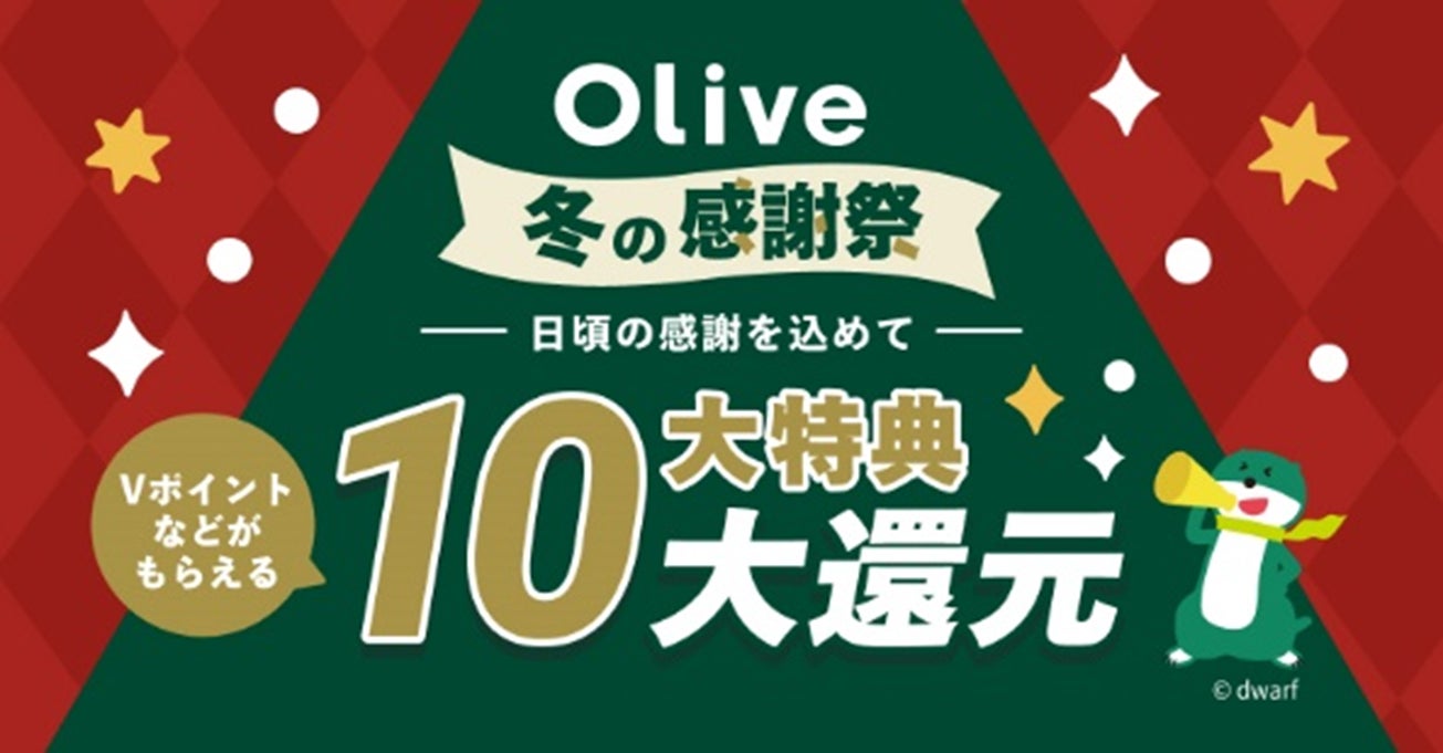 Oliveアカウントをお持ちの方を対象に、日頃の感謝を込めてVポイントなどがもらえる10大特典大還元~Olive 冬の感謝祭~を開催します。全ての特典をもらえるのは、12月までとなります。