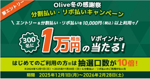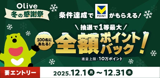 さらに、Oliveアカウントをお持ちのお客さまを対象に、日頃の感謝を込めて、Vポイントなどがもらえる10大特典大還元!~Olive 冬の感謝祭~を実施します。なお、全ての特典をご利用いただけるのは12月までとなりますので、お早めにご参加ください。キャンペーン期間中に、Oliveアカウントをお申込いただいた方もご参加いただけます。