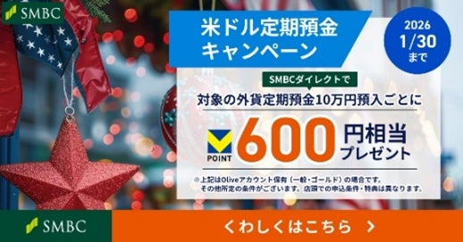 円から米ドル定期預金(3ヵ月または6ヵ月)への預入で、10万円ごとに600円相当のVポイントをプレゼントいたします。SMBCダイレクトなら、いつでも円から預入時の為替手数料が無料です。