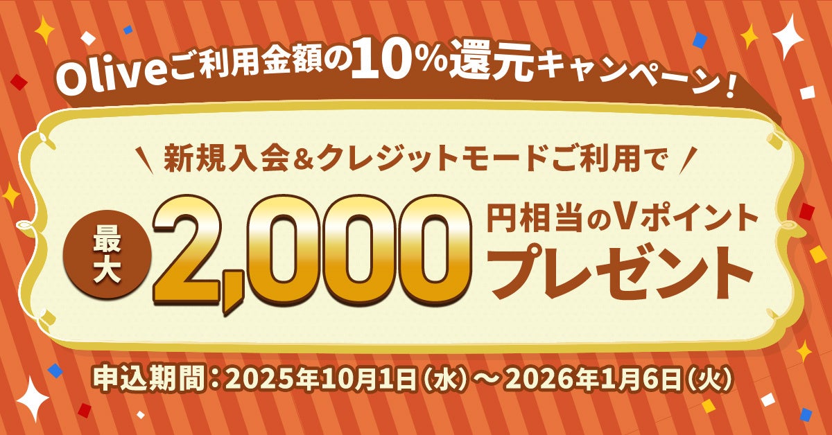 Oliveフレキシブルペイ(クレジットモード)に新規入会し、ご入会月+1ヵ月後末までを対象期間として、クレジットモードでのご利用金額を集計し、10%※を乗じた金額相当のVポイント(最大2,000円相当)がもらえるキャンペーンです。