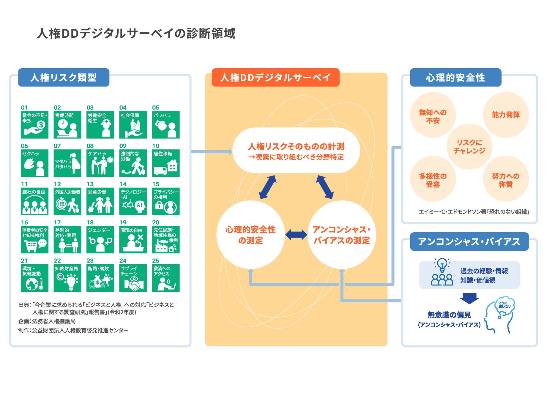”人権リスク診断”、”心理的安全性診断”、”アンコンシャス・バイアス診断”の3つの診断領域で自社の人権リスクを定量的に測定するサービスです。