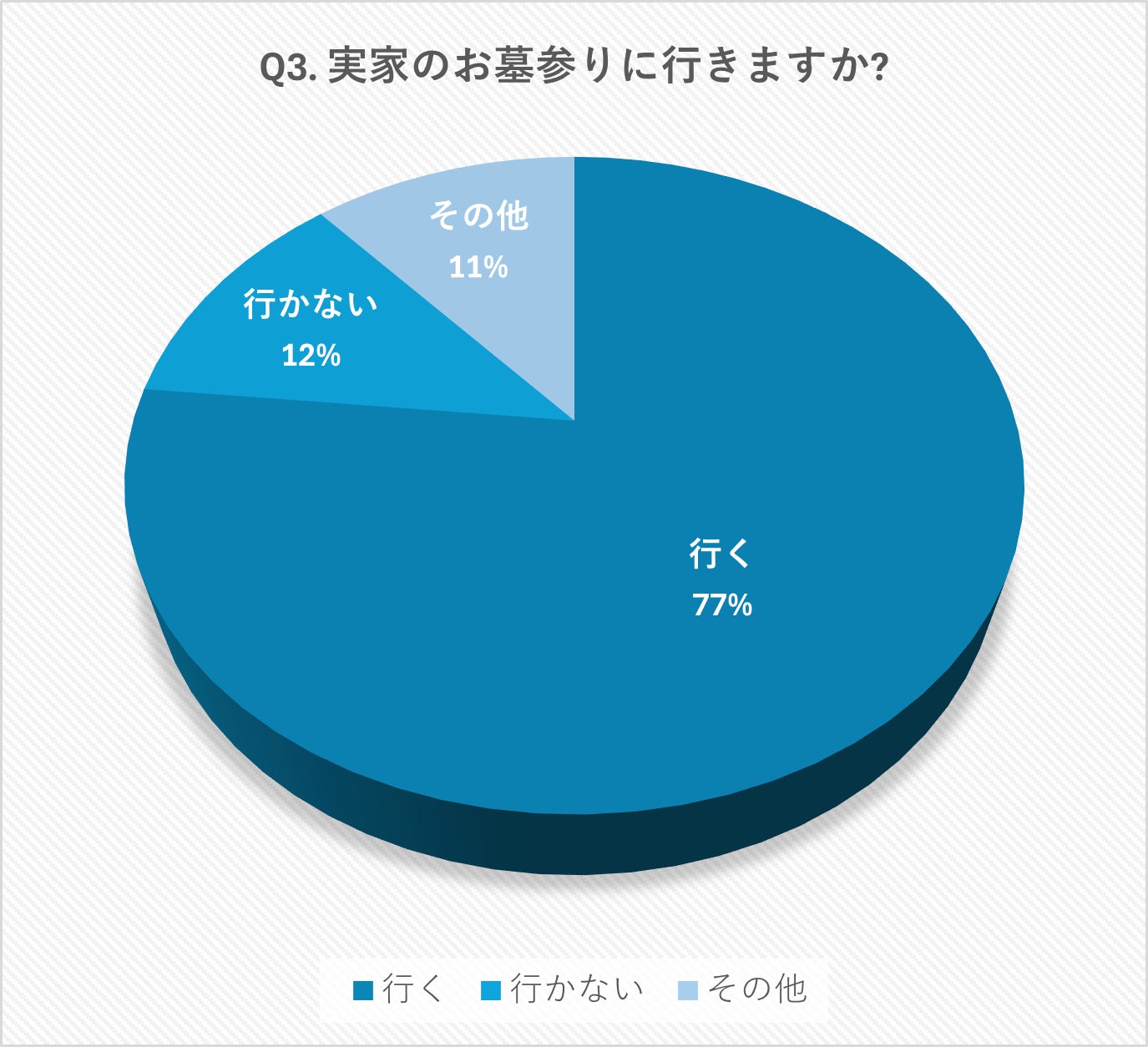 「実家のお墓参りに行きますか?」の質問には、「行く(77%)」「行かない(12%)」「その他(11%)」という回答になりました。