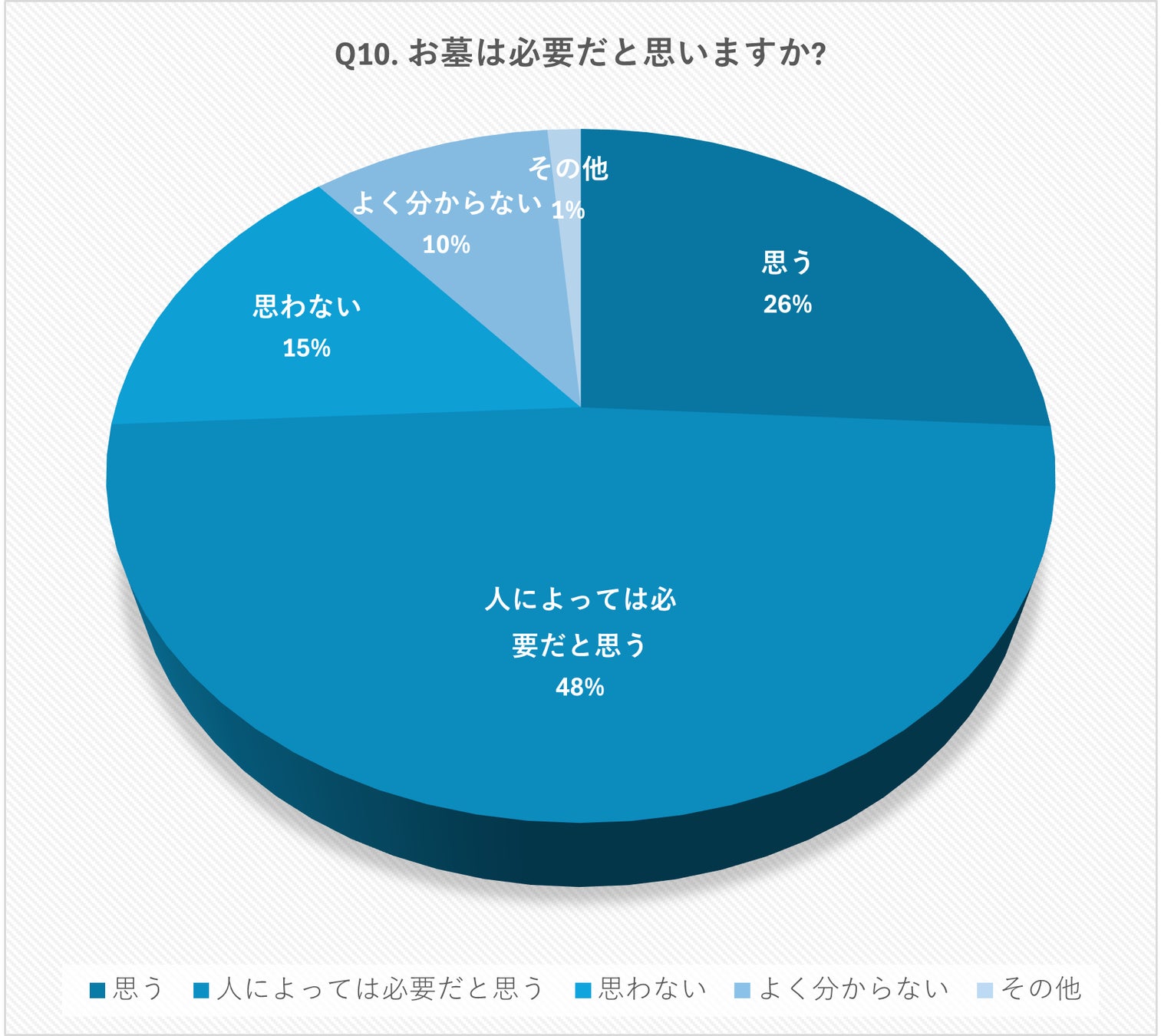 「お墓は必要だと思いますか?」の質問には、上から順番に「人によっては必要だと思う」「思う」「思わない」「よく分からない」「その他」という回答になりました。