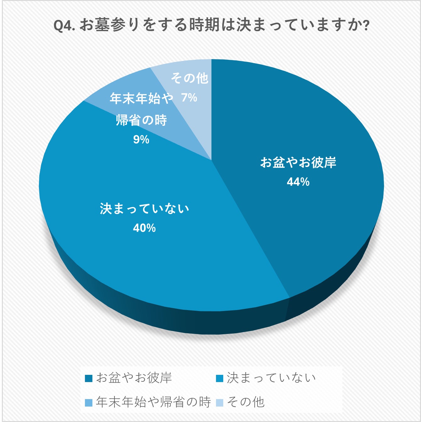 「お墓参りをする時期は決まっていますか?」の質問には、「お盆やお彼岸(44%)」「決まっていない(40%)」「年末年始や帰省の時(9%)」「その他(7%)」という回答になりました。