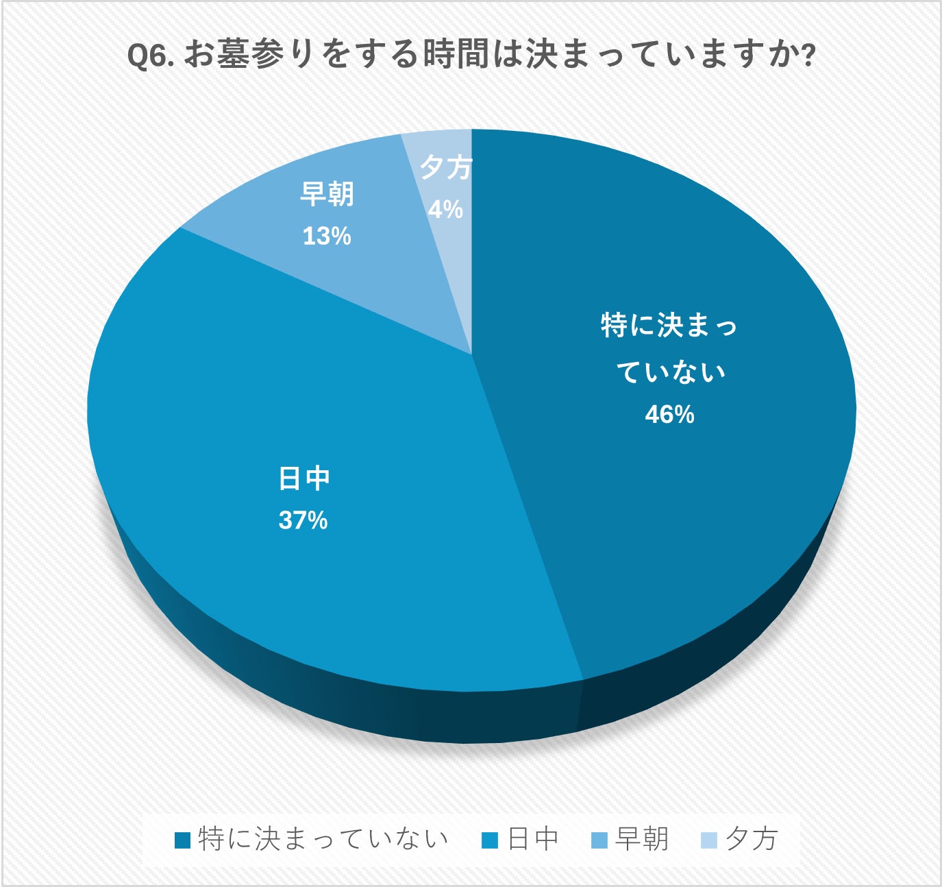 「お墓参りをする時間は決まっていますか?」の質問には、上から順番に「特に決まっていない」「日中」「早朝」「夕方」という回答になりました。