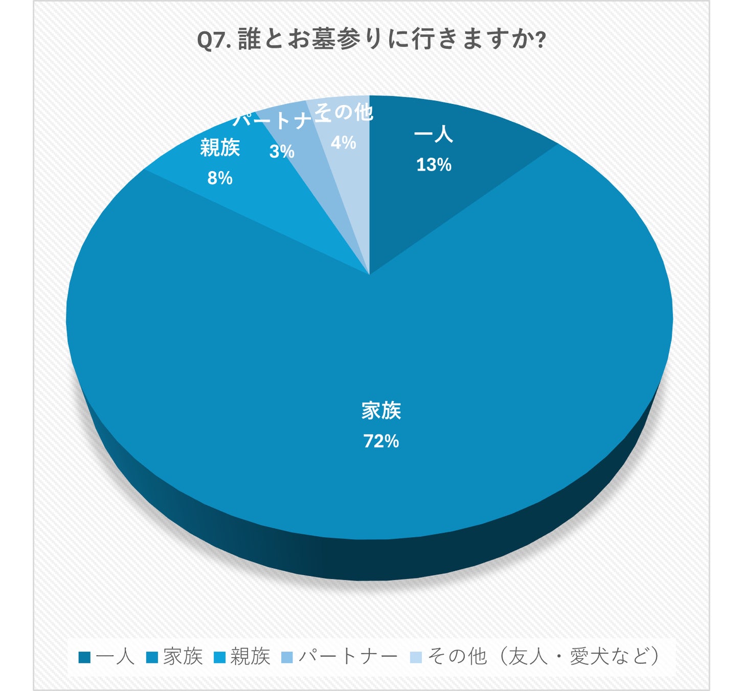 この結果からは、大多数が家族と一緒にお墓参りをすることが分かりました。Q4でお盆やお彼岸にお墓参りをする方が約半数を占めていたことからも伺えるように、家族が集まるタイミングでお墓参りをするという意識が高いことが伺えます。
