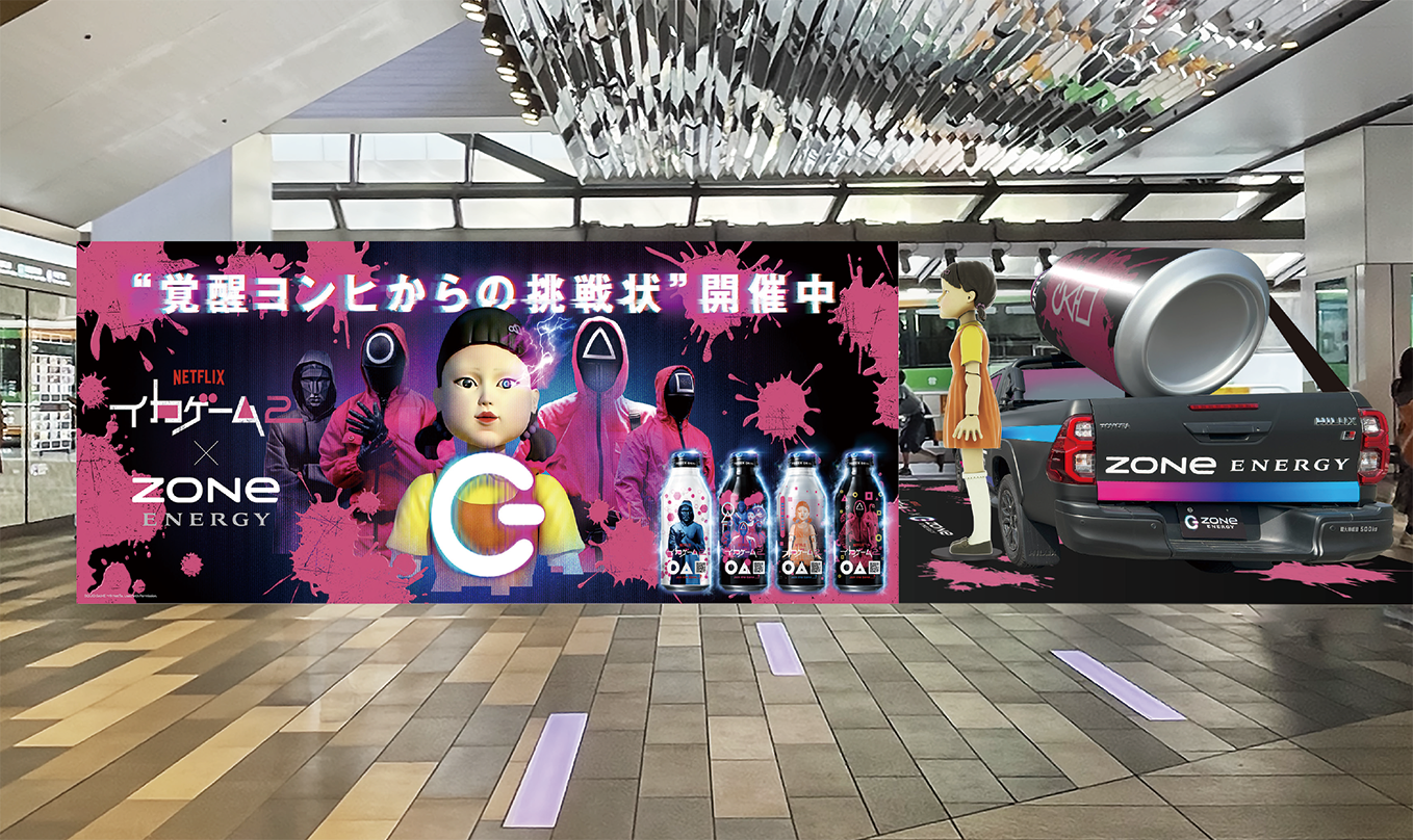 プレイヤーが、ゲームを通して思いがけない集中力や知恵で窮地を乗り越えていく「イカゲーム」の世界観と、「新しい才能の解放」をブランドパーパスとして掲げるZONeエナジーが、“極限の挑戦”というテーマの元、コラボレーションいたしました。キービジュアルでは、「イカゲーム」の象徴的キャラクターであるヨンヒが、ZONeエナジー仕様となって登場。エナジーの力で、より強大な敵として立ちはだかる様子を表現いたしました。