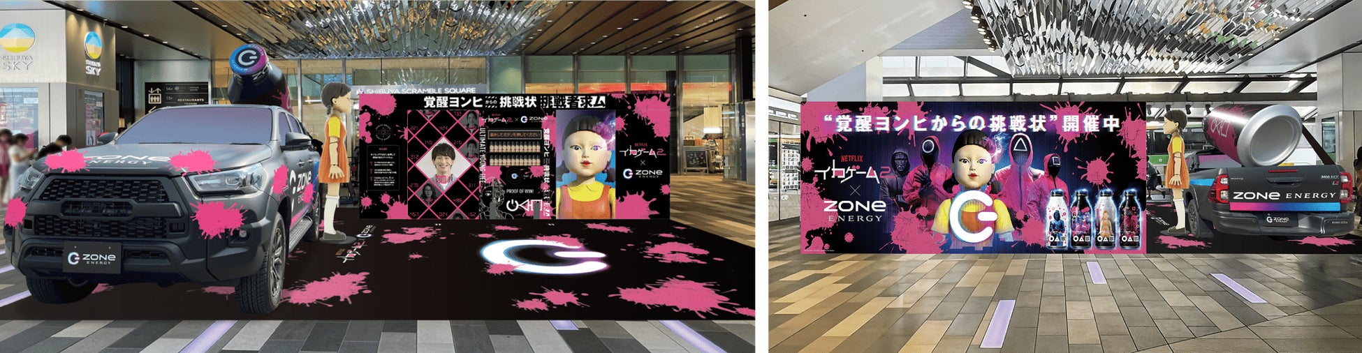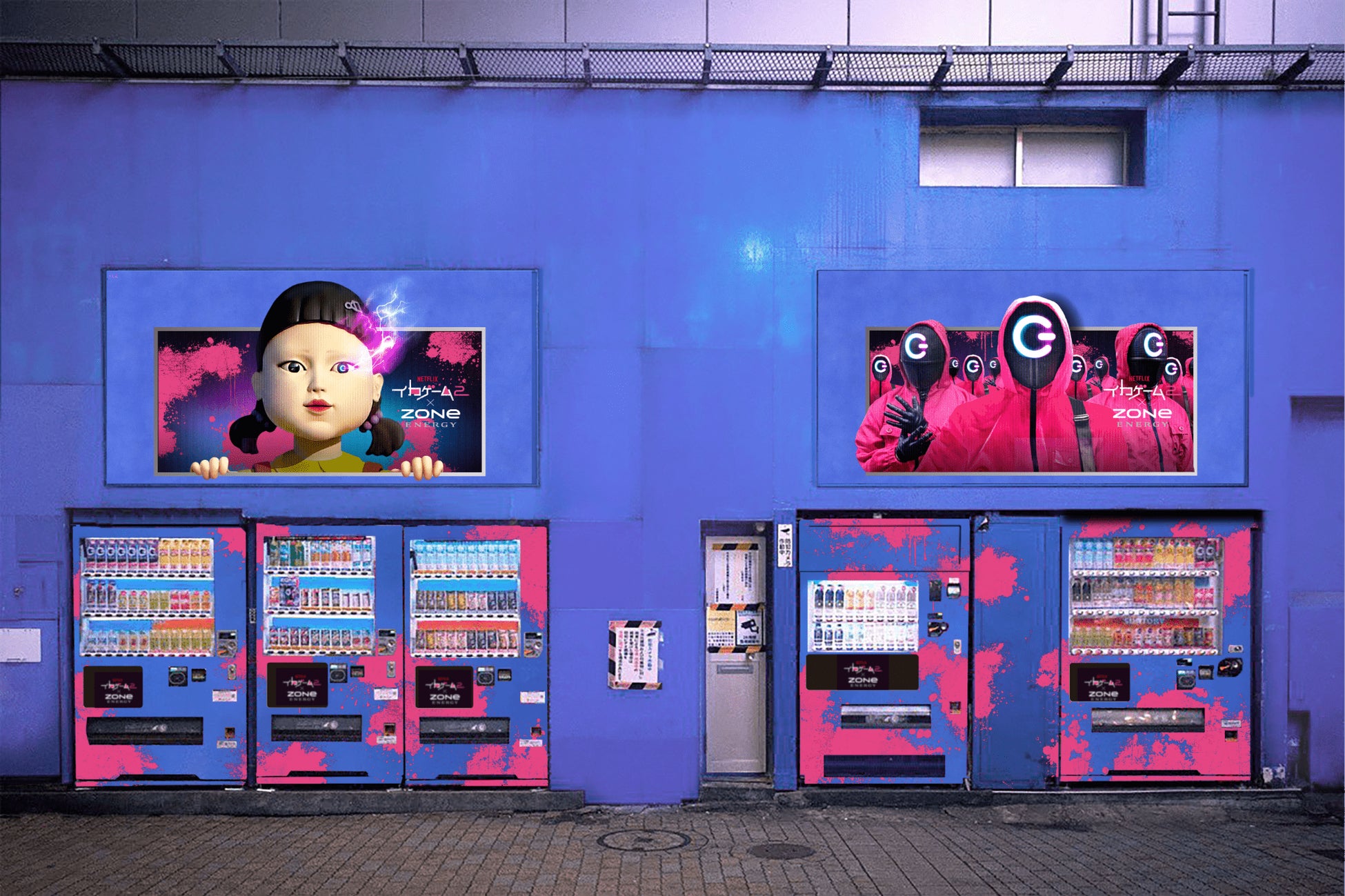 ビルボードは、象徴的なブルーの壁面をバックに、巨大な覚醒ヨンヒとZONe仕様のピンクガードの集団が通行人をじっと眺めるという、インパクトのあるデザインです。またビルボードの直下には、イカゲームピンクでデコレーションされたラッピング自販機も登場し、コラボの世界観をお楽しみいただけます。