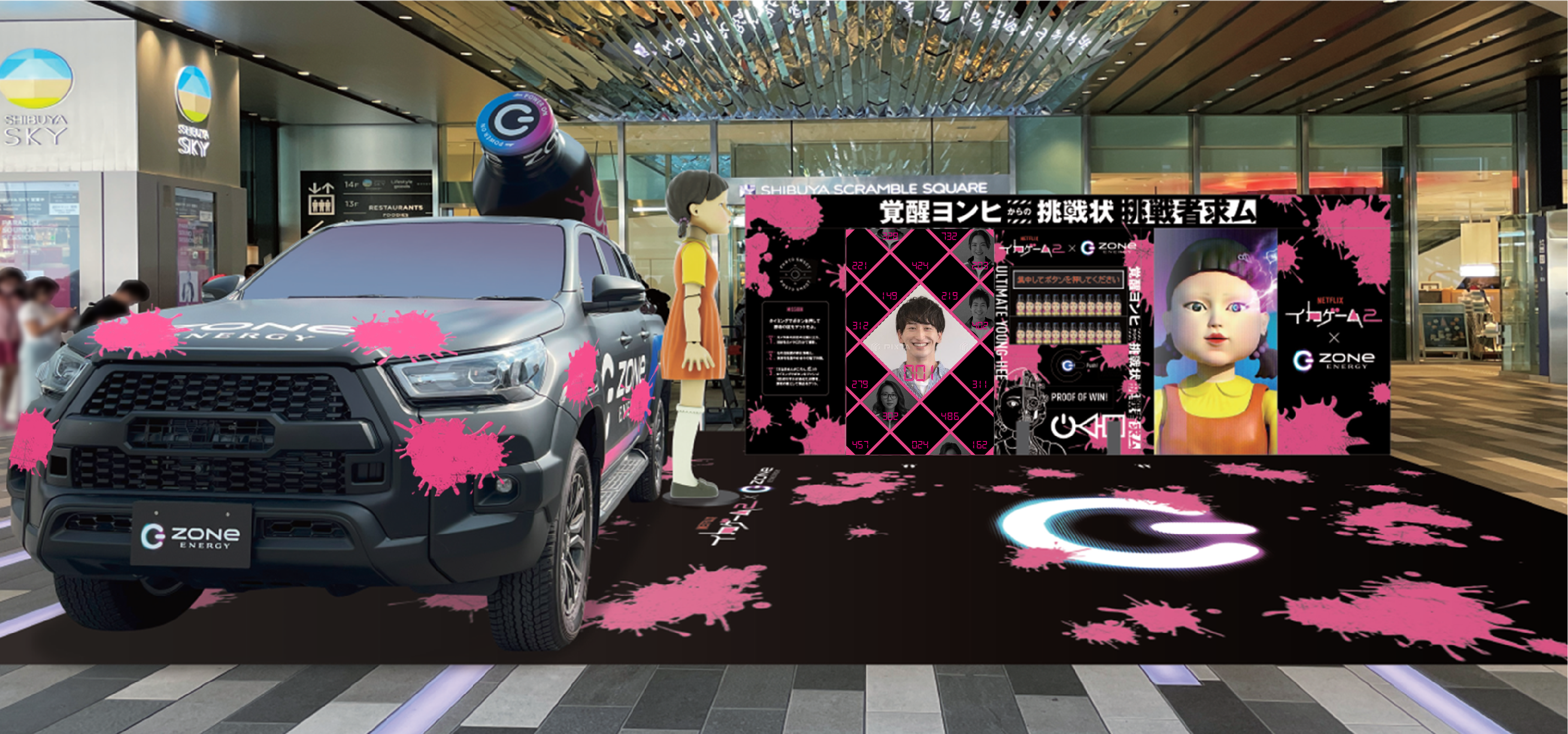 また、イベント会場ではリアルヨンヒ人形とイカゲームピンクにラッピングされたZONeカーを展示したフォトスポットも用意いたします。さらに、限定デザインのサンプリング缶も配布いたします。近くをお通りの際には是非、ご参加ください。