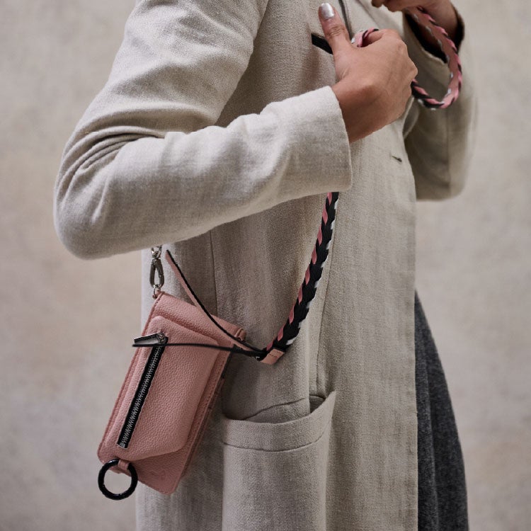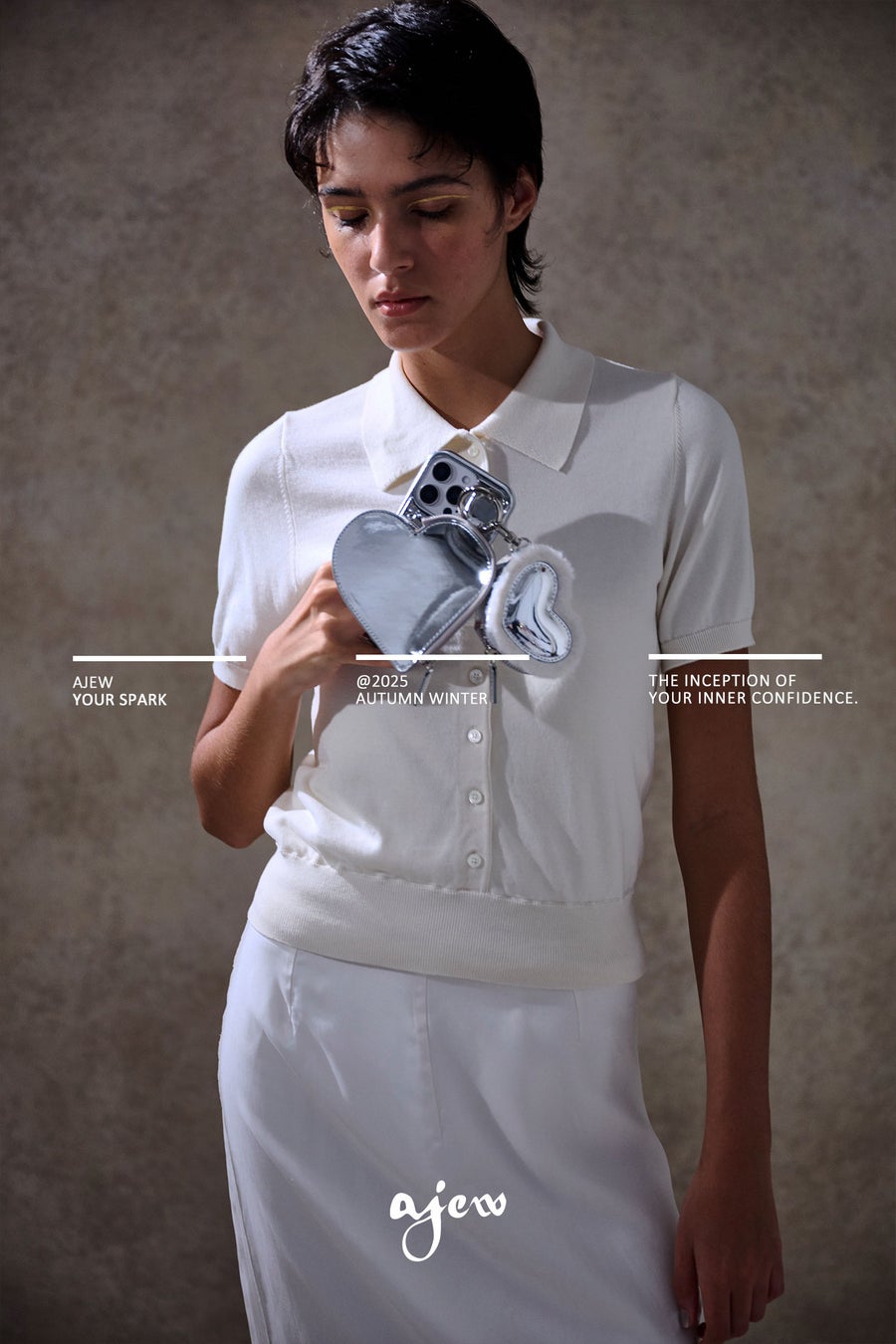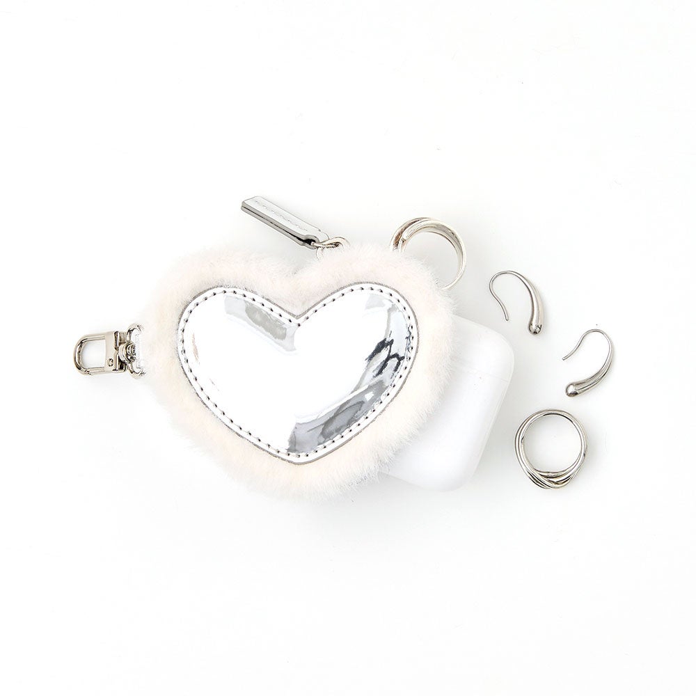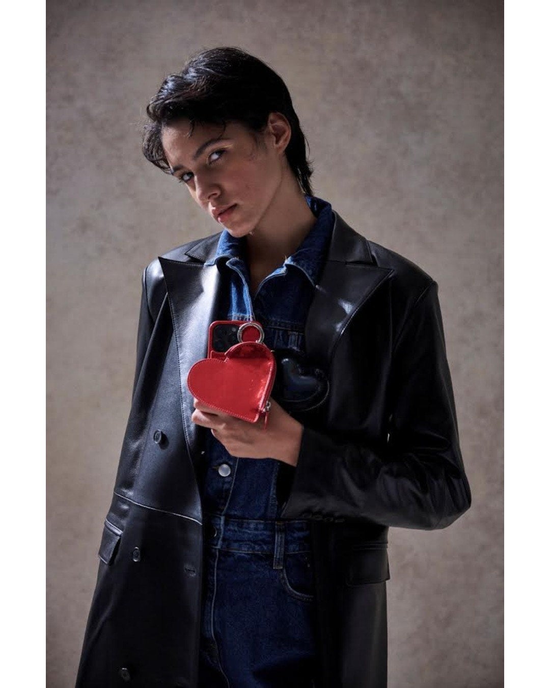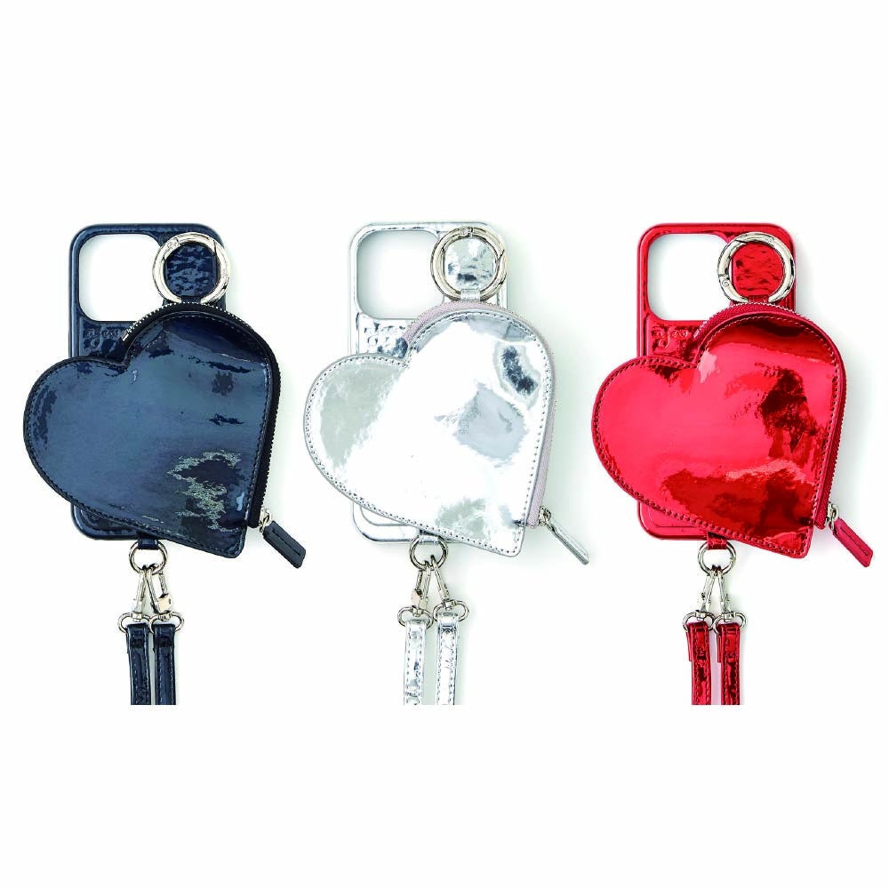 ケースに大胆にドッキングされたハートモチーフはジップ付きポケット。カードが収納できるサイズ感でハート型を表現し、車や家の鍵・イヤフォンなど嵩張るモノも収納可能。