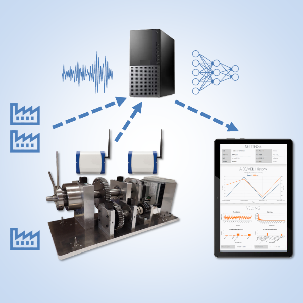 熟練技能者の診断プロセスをマルチモーダルニューラルネットワーク上に再現し、長年の保全作業で蓄積したカルテデータを用いてトレーニングした機械学習モデルを実装したシステム。正常・異常の判定(最大値、RMS、CF)から異常要因や兆候の特定までを自動化します。送風機を含む一般回転機器、ポンプ、電動機、増・減速機などの設備に対応しており、複数設備をサーバーで一元管理することができます。専用の無線センサーを接続することでリモートによる常時監視も可能です。