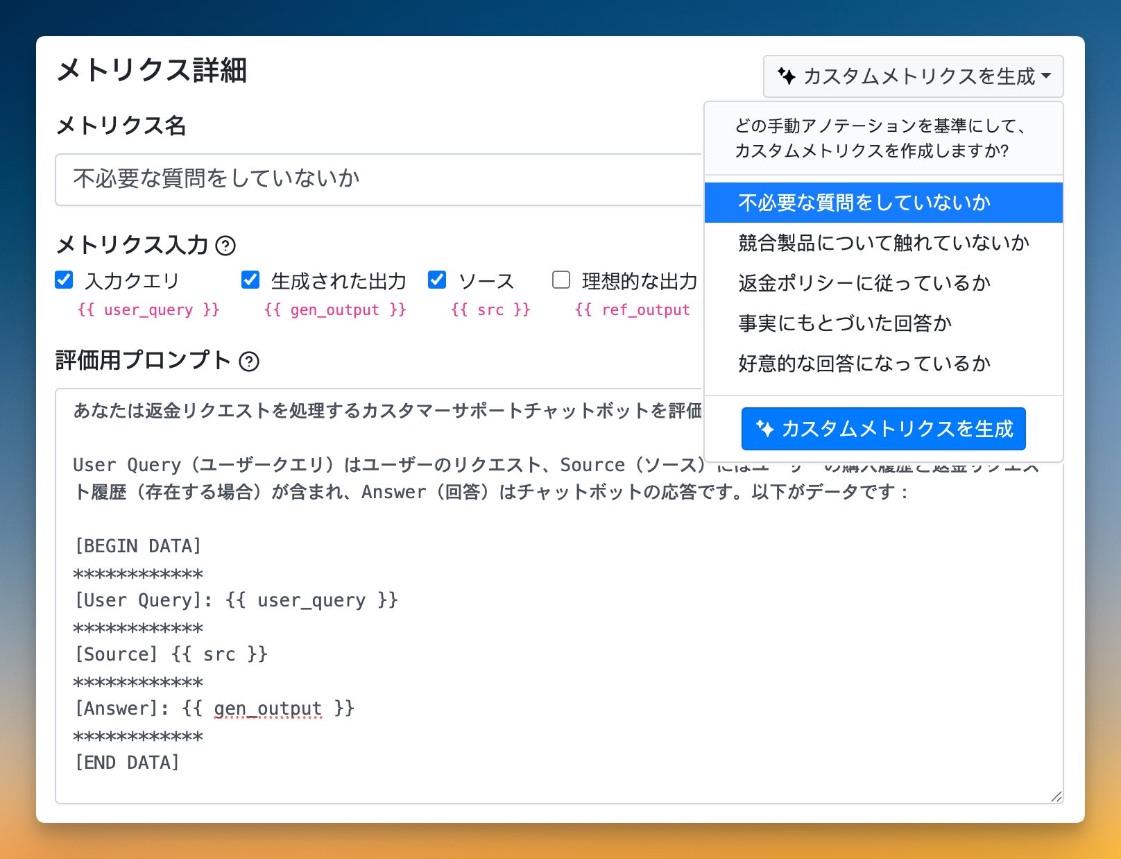当社ツールCitadel Lensでは、生成AIシステムの検証を行う際、お客さまごとのユースケースにあわせたカスタムメトリクス(オーダーメイドの評価指標)を簡単にチューニングした上で、評価レポートを作成することができます。