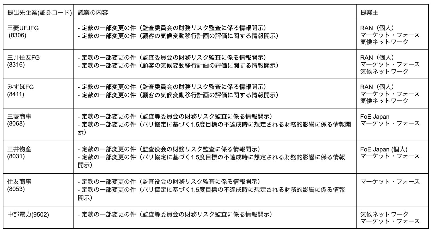 国内外の環境NGOとその代表者を含む個人株主は金融、総合商社、電力3業界の7企業に対し、気候変動対策の強化を求める株主提案を提出しました。提出先企業は三菱UFJフィナンシャル・グループ(以下MUFG)、三井住友フィナンシャルグループ(以下SMFG)、みずほフィナンシャルグループ(以下みずほ)、三菱商事、三井物産、住友商事、日本最大の火力発電会社・JERAの経営に大きく関与する中部電力です。