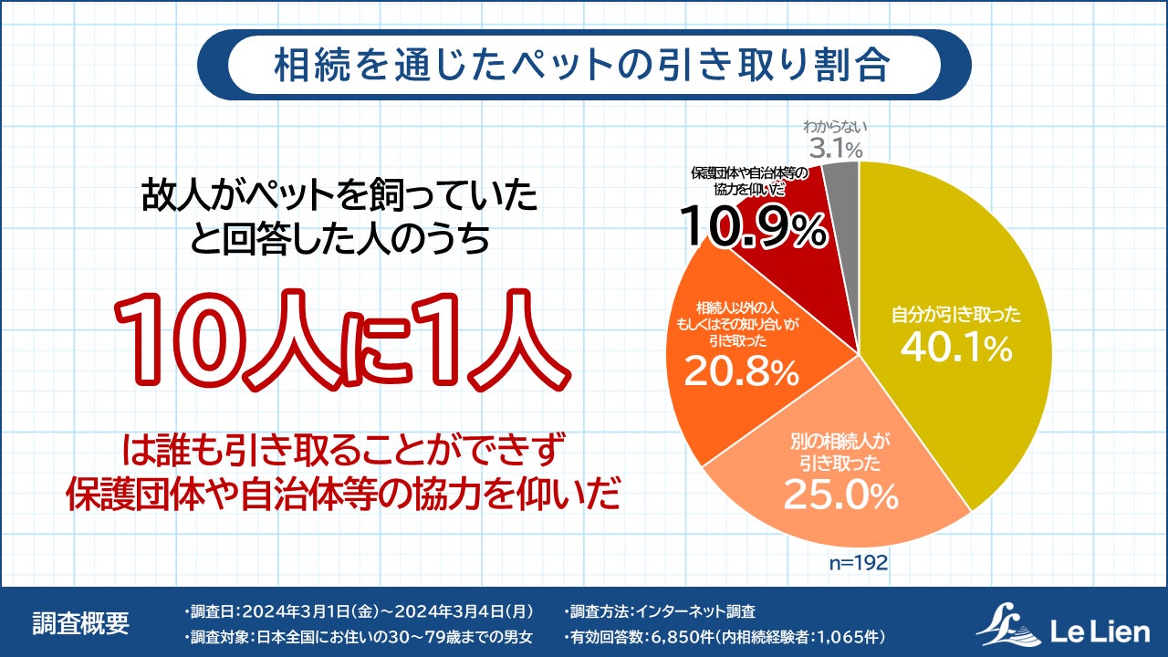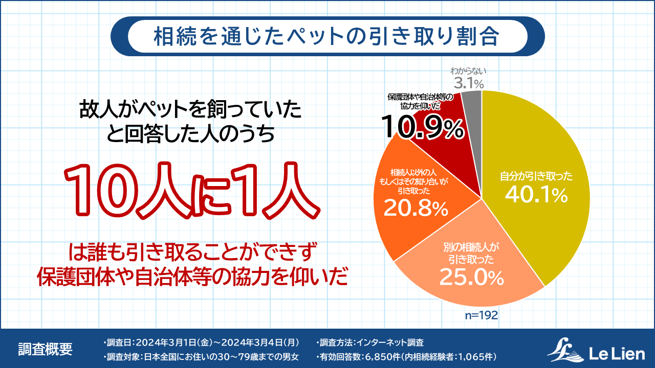 親の死による相続の経験者1,065人のうち、「故人がペットを飼っていた」と回答した192人中10.9%の人が「誰も引き取ることができず保護団体や自治体等の協力を仰いだ」と回答しました。85%以上の人は自分もしくは誰かが引き取ったと回答していますが、約10人に1人は、誰も引き取ることができない状況だったことがわかりました。