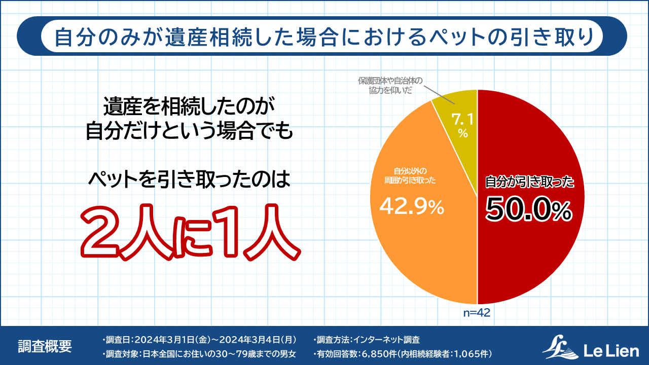 親の死による相続の経験者1,065人のうち、「自分1人が遺産を相続した」と回答した42人にペットの引き取り状況を聞いたところ、「自分が引き取った」という回答は50.0%でした。後述の通りペットも動産に相当する遺産となり得ますが、「自分1人が遺産を相続した(相続人が1人だけ、あるいは、遺言書や遺産分割協議により1人だけが相続したものと考えられる)」というケースにおいても、半数程度の引き取りにとどまることがわかりました。