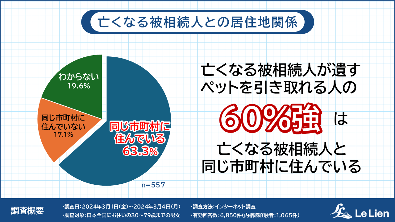 相続経験の有無を問わない全回答者6,184人の中で、次に直面する相続の機会に遺されるであろうペットについて「自分が引き取れる」と回答した557人について居住地を聞いたところ、63.3%から「亡くなる被相続人と同じ市町村に住んでいる」と回答を得ました。