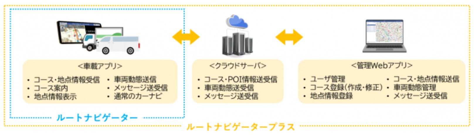 「ルートナビゲータープラス」は、ルート配送や収集、点検、送迎など、固定ルートを巡回するための業務用カーナビアプリケーションです。従来は車両に搭載したタブレットで走行ルートを案内する車載アプリのみの提供でしたが、ルートナビゲータープラスでは「車載アプリ」に加え、事業所で利用する「管理アプリ」を合わせて提供し、同時にクラウドサーバーに接続することで巡回先やコース、車両の現在位置やドライバーなどの情報をリアルタイムに共有することが可能になります。管理アプリ側で編集したその日のコースや訪問地点の追加などもタイムリーに連携出来るため、より効率的な業務運営に貢献します。