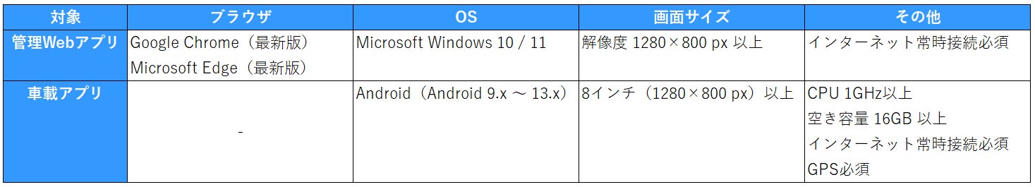 車載アプリは車両端末にインストールされた状態で提供され、管理アプリはWebブラウザ上で動作するためインストールや設定の手間は一切不要です。ライセンスが届いたその日から、すぐに業務でご利用いただけます。