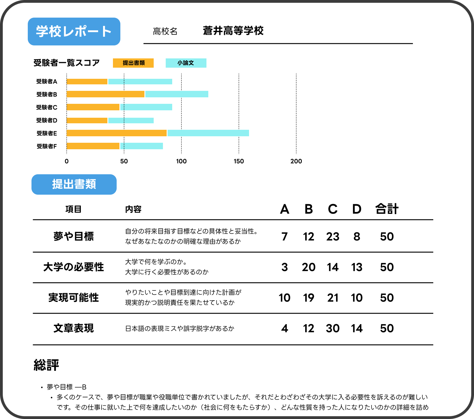 学校団体受験では個人受験とは異なり、生徒が手書きで書いた小論文の添削が可能であるほか、実施日は学校様ごとに相談の上で設定させていただきます。また、個人ごとの採点結果とは別に、受験者全体の傾向や強み、弱点がわかる学校別レポートをお送りいたします。こちらのレポートを使用して学校のカリキュラムやプログラムの改善も可能となっております。昨年は、3校での実施を行い、50名ほどの高校3年生に模試の受験をいただきました。引き続き高校向けのサポートの一貫として提供いたします。