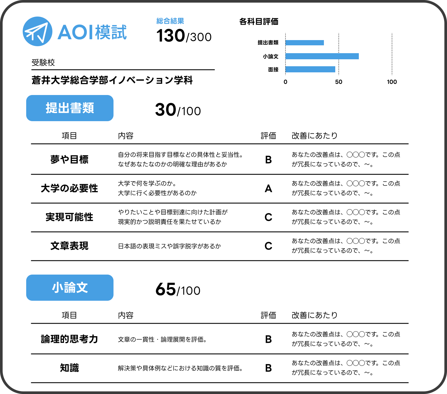 年内入試と呼ばれる総合型選抜や学校推薦型選抜では、一般選抜のような明確な答えが存在しないため、現在の実力や自身の弱点が掴みにくいという課題があります。「AOI模試」では提出書類や小論文、二次対策の面接などの完成度合いを「数値」で評価し、客観的な視点から受験合格をサポートいたします。