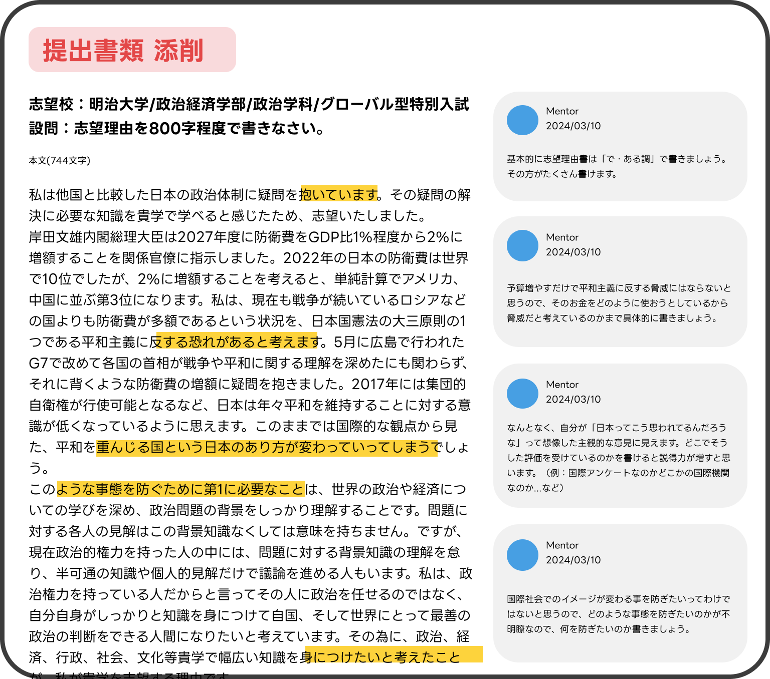 AOI模試では模試結果を点数化した資料とは別に、提出された提出された志望理由書および小論文の添削を行います。自分の提出したテキストに、総評と個別のコメントがつけられます。総評では、全体を通してよかった点とより良くできる点、個別の文章にはよりピンポイントに修正すべき点が記載されます。