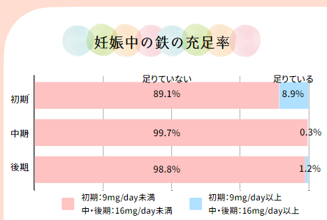 「もっとも多くの妊婦さんが不足していた鉄は貧血や産後うつのリスクになるともいわれています。鉄は充足するまである程度時間がかかるので、早い段階から継続して十分に摂取するとよいでしょう」