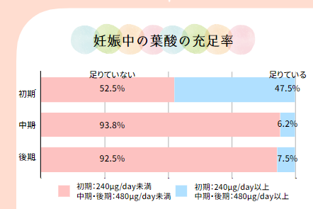 日本女性の“鉄欠乏症貧血”は5人に一人と多く、妊娠後期には約5割もの妊婦が貧血を経験する3)ともいわれています。母体の鉄欠乏は早産リスクや低出生体重児リスクを高めてしまう原因でもあり4)、妊娠期を通して、摂取することが望ましい栄養素です。