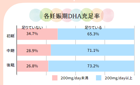 妊娠中胎児の脳は急激に成長していくため、その材料となるDHAはより多く必要となります。国民健康・栄養調査によりn-3系脂肪酸(オメガ3)として妊婦の摂取量は把握できますが、DHAの摂取量は不明でした。今回の調査で国際機関の基準5)からは足りていないが3割程度だということが判明しました。