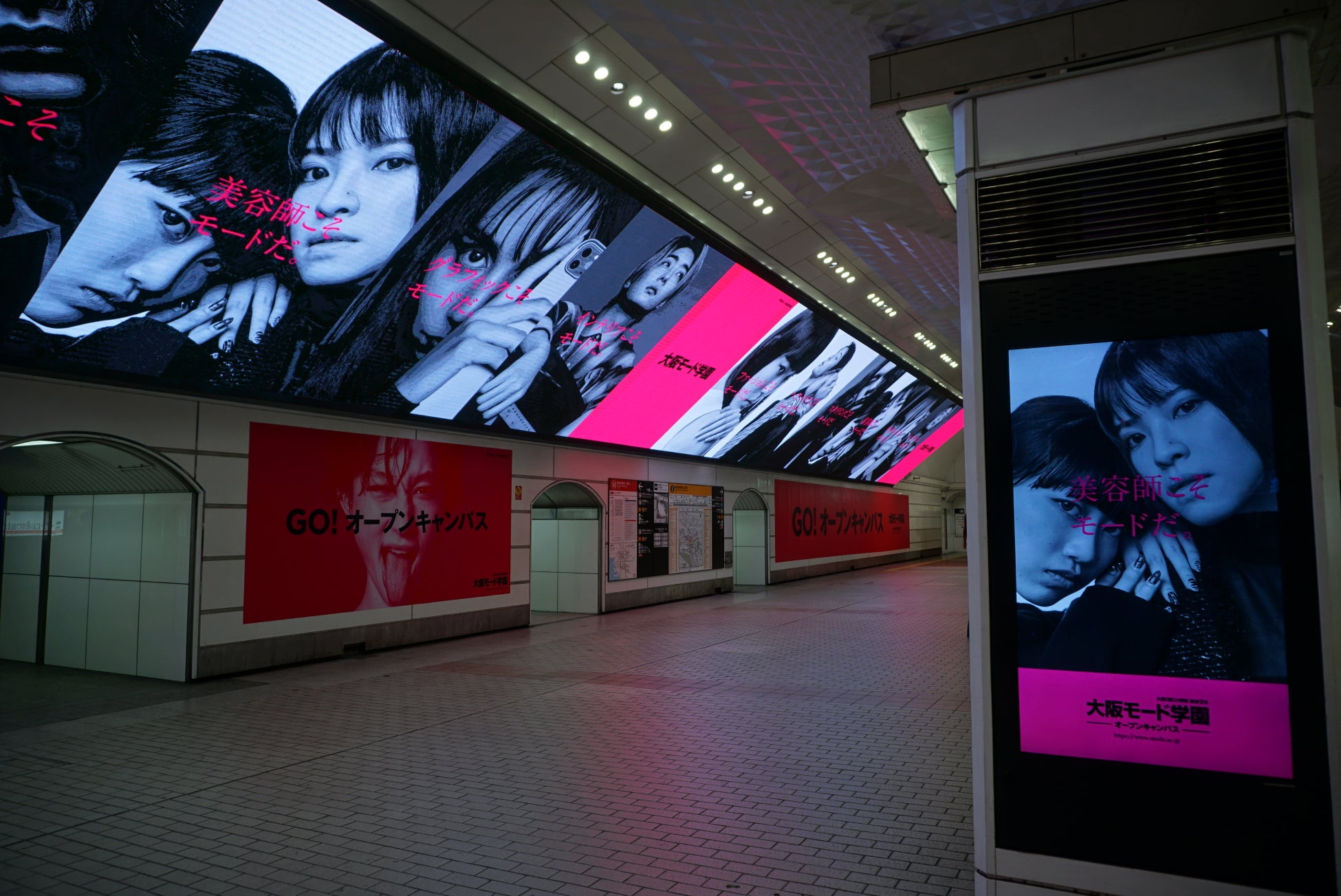大阪メトロアドエラは、大阪モード学園と共同で、Osaka Metro梅田駅にて実施された夏のオープンキャンパスキャンペーンにおいて、デジタルOOHおよびOOH広告の新しい表現手法として、実際の空間には存在していないオブジェクトを配置したシュールOOH(フェイクOOH)を展開しました。