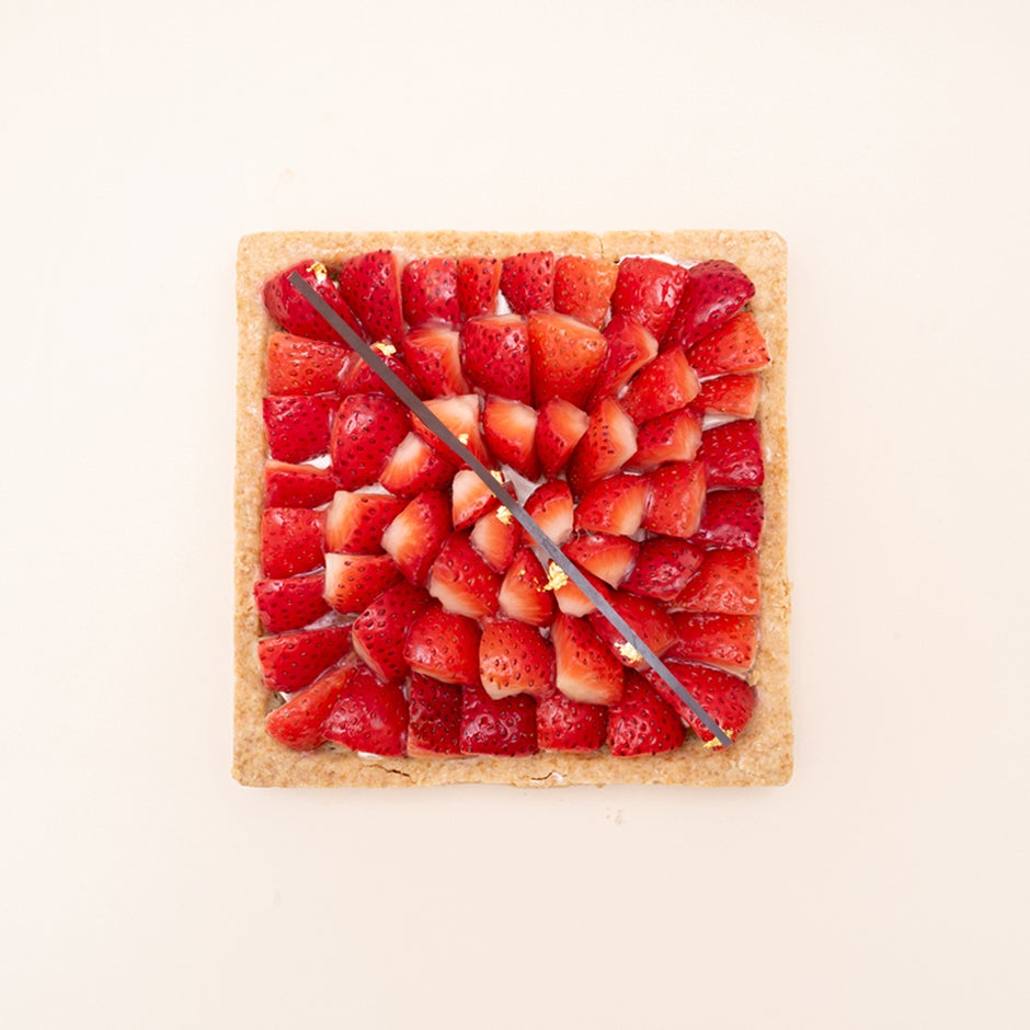 真っ赤に輝くいちごをひとつひとつ丁寧に並べた、ストロベリーのスクエアボックスタルト”。