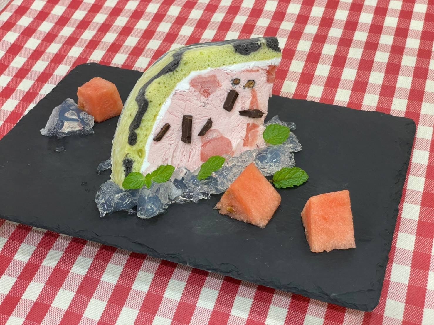 スイカを模したケーキ。サイダーゼリーを添えて見た目も涼し気に。