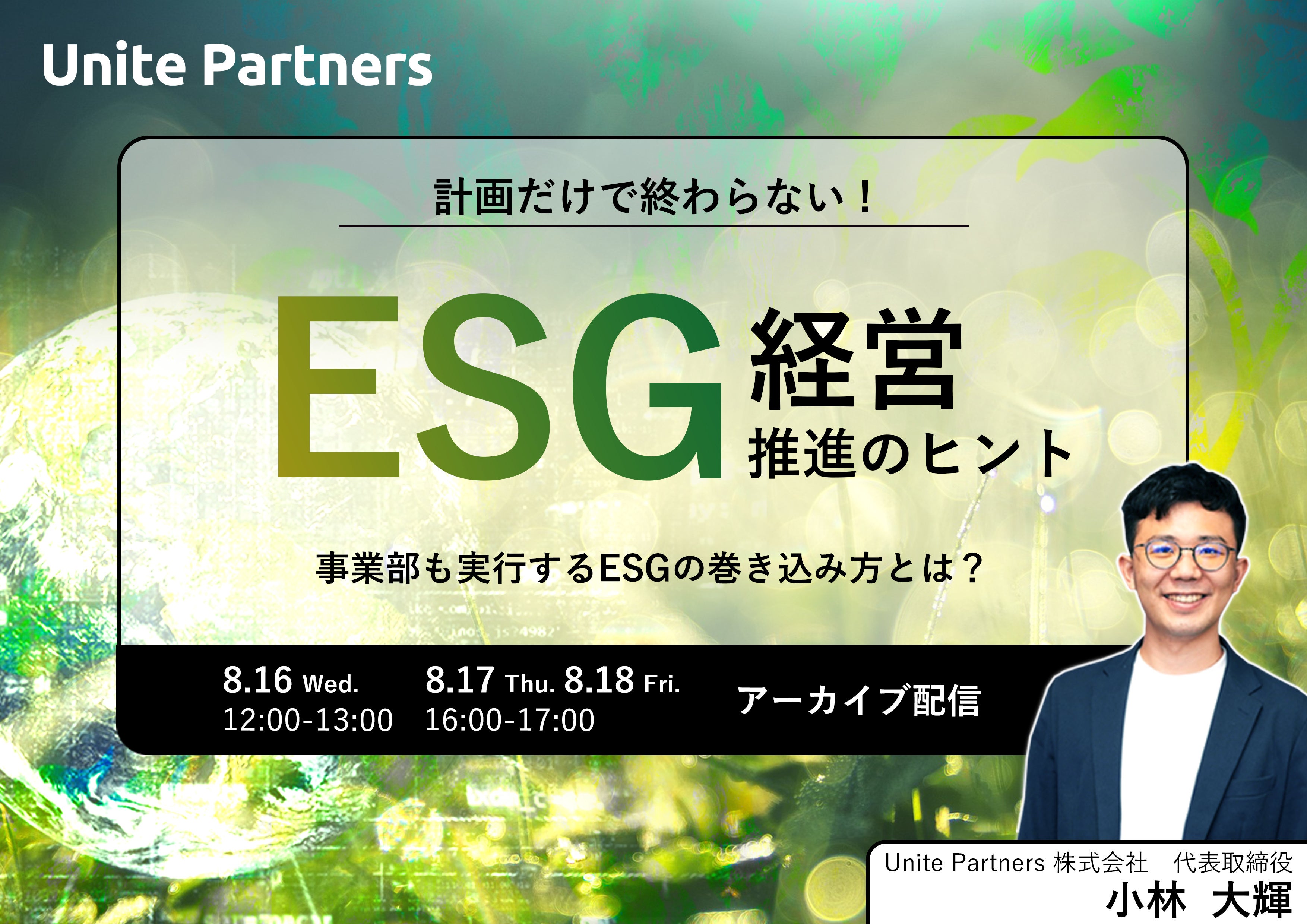 企業の変革パートナーを目指すブティック型コンサルティングファームのUnite Partners株式会社(本社:東京都、代表取締役:小林大輝)は、2023年8月16~18日に、「ESG経営推進のヒント 〜 計画だけで終わらない!事業部も実行するESG推進の巻き込み方とは? 〜 」と題して大企業の経営者や経営企画部門向けのセミナーを開催します。
