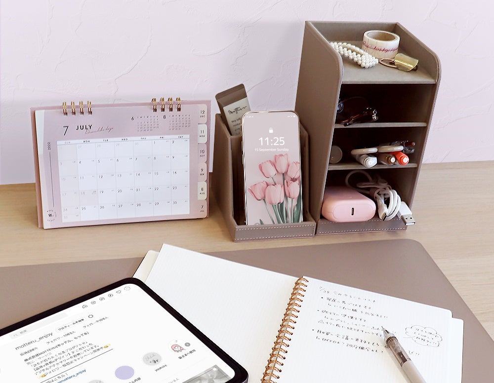 コンパクトなサイズであまり場所を取らないデザインですが、収納性が高く、小物をまとめることができます。小さいサイズのオーガナイザーにはスマホを立てかけられ、スタンドとしての使い勝手が抜群です。大きいサイズのオーガナイザーにはペンなどの筆記用具を入れやすく、取り出しやすいように口を斜めにしています。