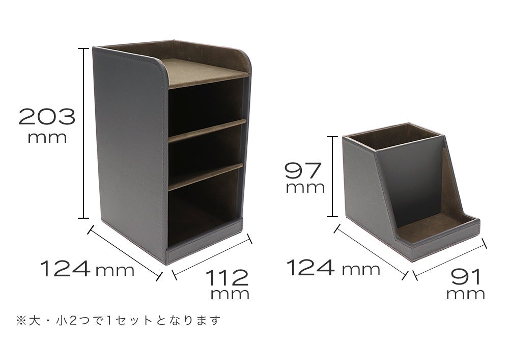 サイズ違いのオーガナイザー2つがセットとなっているので、2つ並べても、1つはデスク、1つはリビングにと使い分けても便利な商品です。