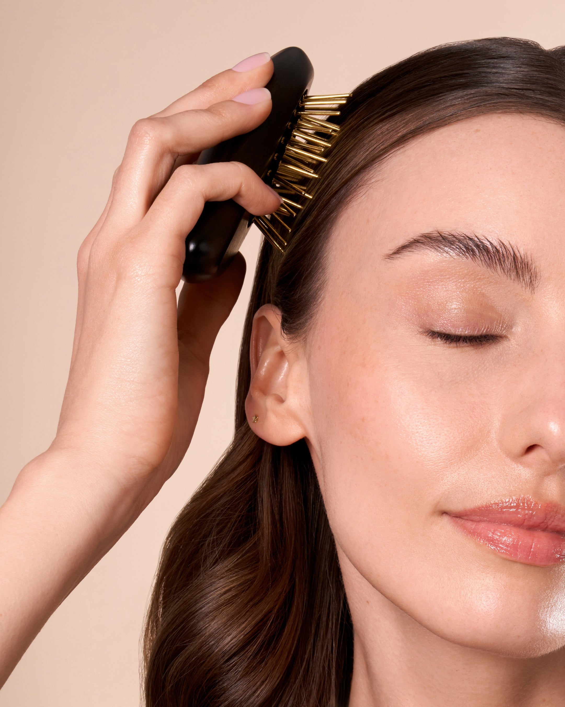 頭皮ケア:乾いた髪に対し、生え際から後頭部にかけてゆっくりとブラシを動かし巡りをサポートするための適度な圧力を加えます。