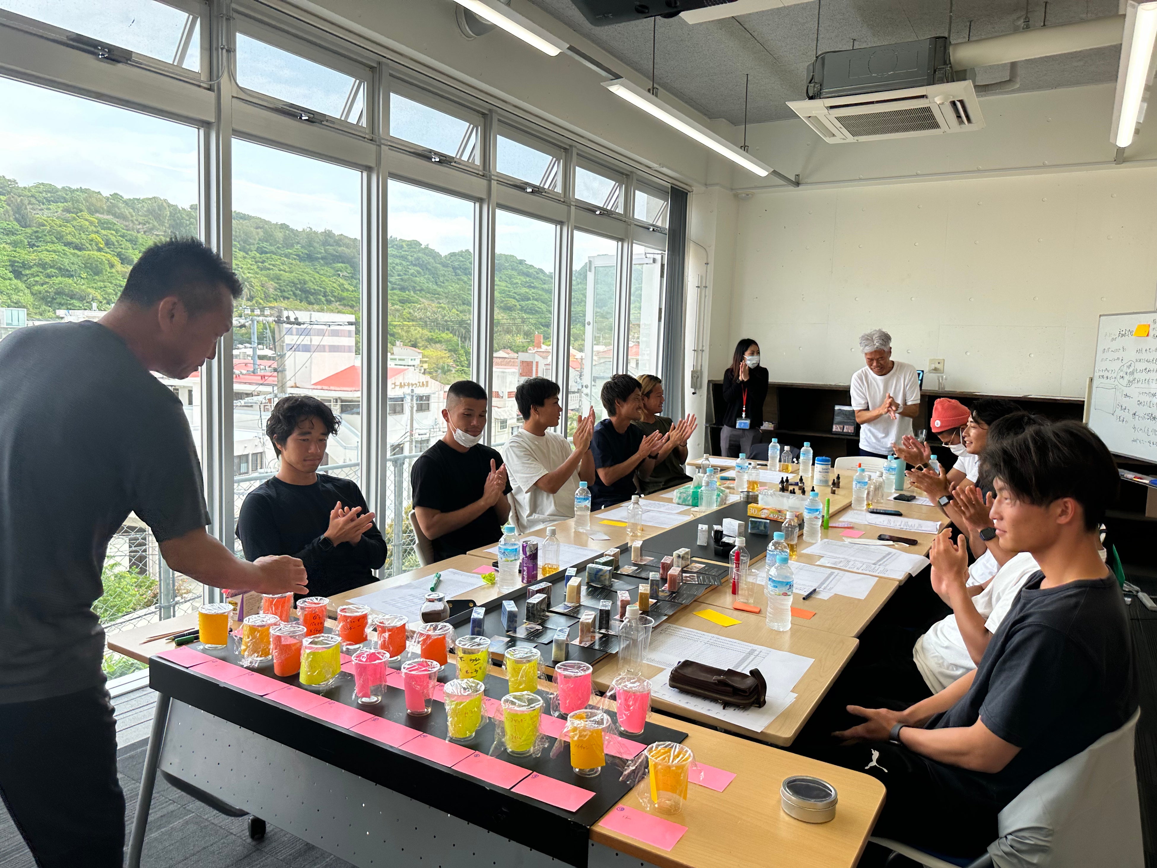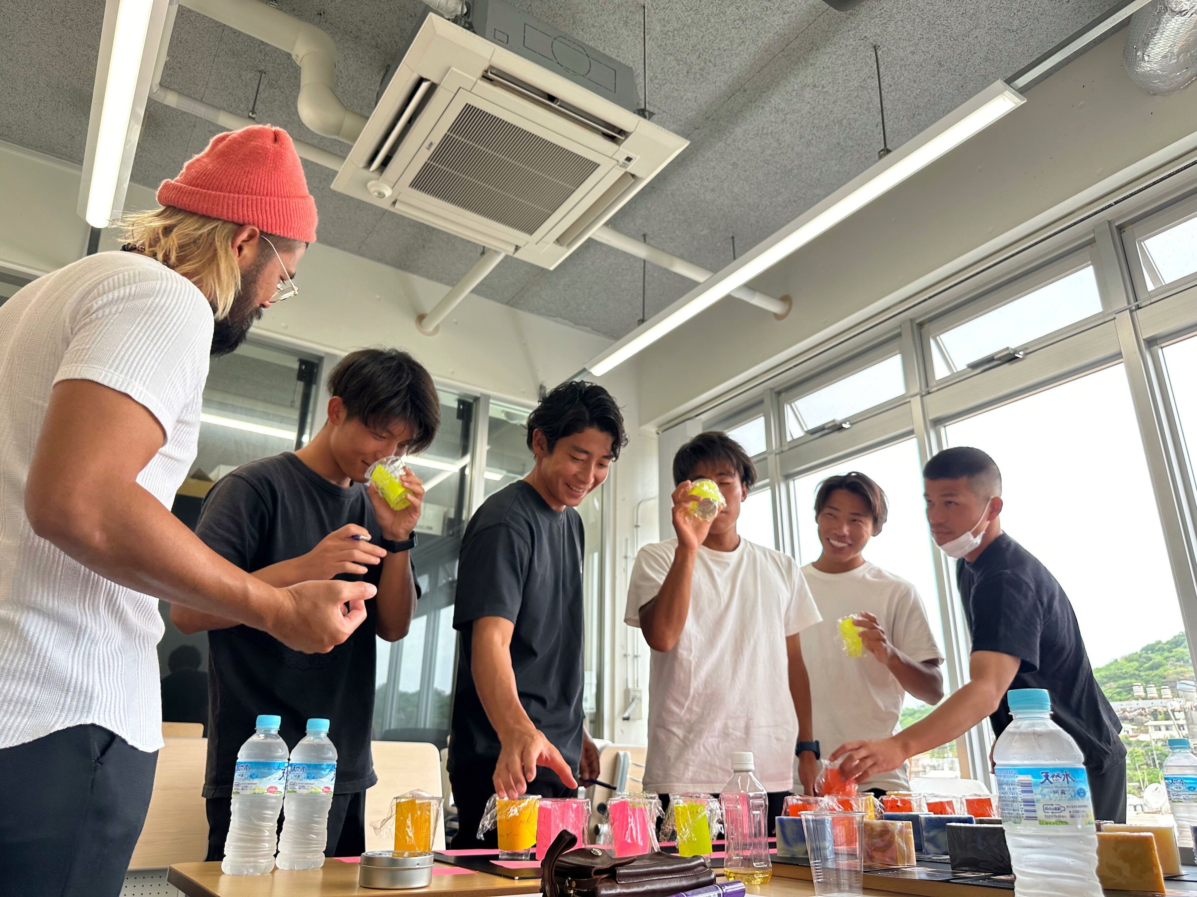 香りはソーマプライア沖縄の選手たちが気持ちを込めた香りを作り、首里石鹸メンバーと議論を重ねて香りが完成しました。香りを通して沖縄体験と感動を、そして皆様にとって居心地の良い帰れる場所で在りたいと願いを込めて制作しています。