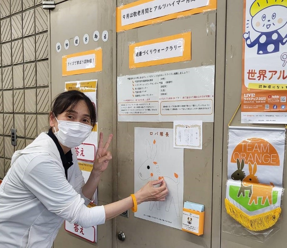 認知症サポーターキャラバンマスコットのロバ隊長に、オレンジ色のシールを貼って染め、認知症になっても安心して暮らせるまちをめざします。認知症クイズにも挑戦してください。