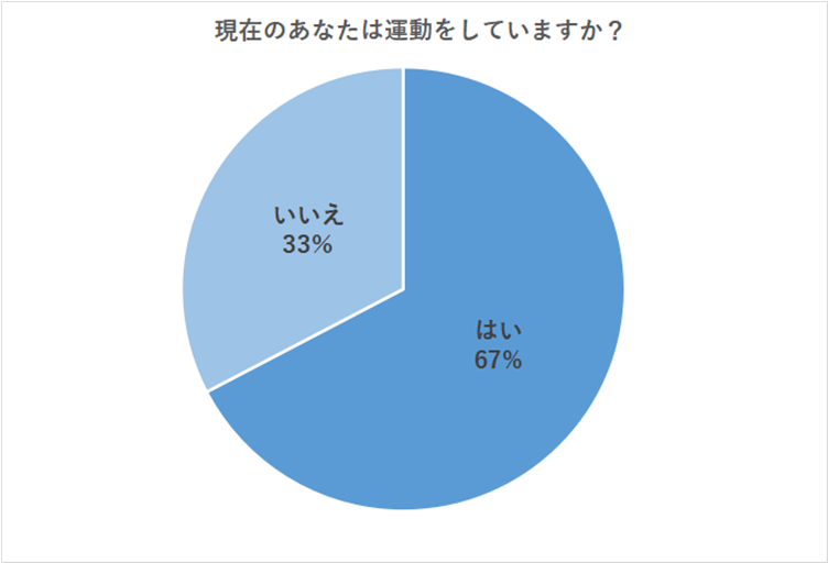 こちらは意識している方の数と比べて若干数値を落としたものの、全体の67%の方が実際に行動に移し運動している結果となりました。