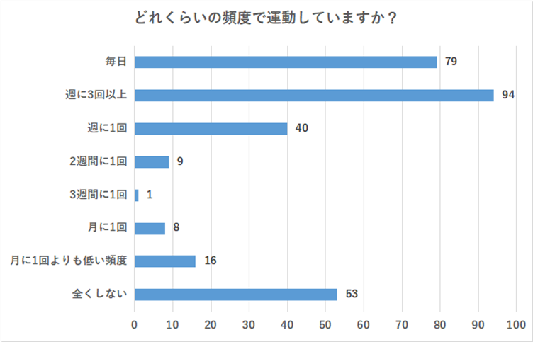 「どれくらいの頻度で運動していますか?」という質問をしたところ、「週に3回以上」と回答した方が最も多い結果となりました。