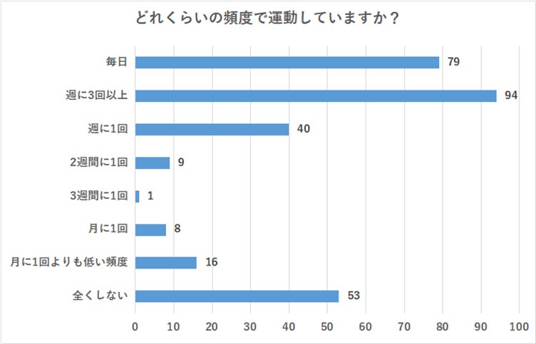 また、「全くしない」という方は53名いらっしゃいましたが、先述した現在運動しているかどうかのアンケートで「運動をしていない」と回答した方が98名だったことから、運動をしていない中でも半数近くの方が健康を意識して少なからず体を動かしているようです。