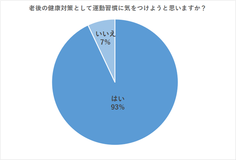 老後の健康対策として運動習慣を意識しているかどうか、質問したところ全体の93%の方が意識していると回答する結果となりました。