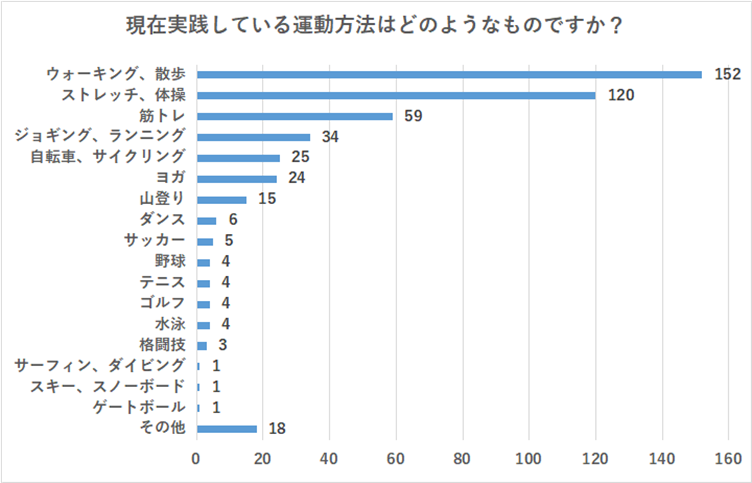 先ほどのアンケート結果で、健康を意識している方が多い結果となりましたが、実際に運動をしている方はどのようなことを実践しているのでしょうか。