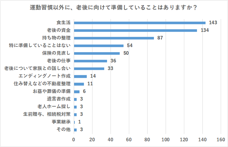 みなさんが運動以外にも老後に向けて準備していることについて伺ったところ、「食生活」が一番多くの票を集めました。