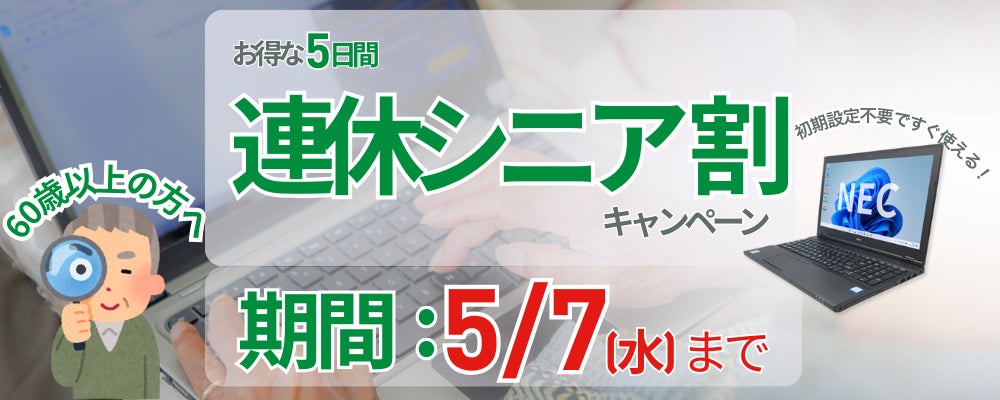 【連休シニア割】PC nextでゴールデンウィーク開催 60歳以上の方へお得な5日間 再生パソコン最大5,000円OFF