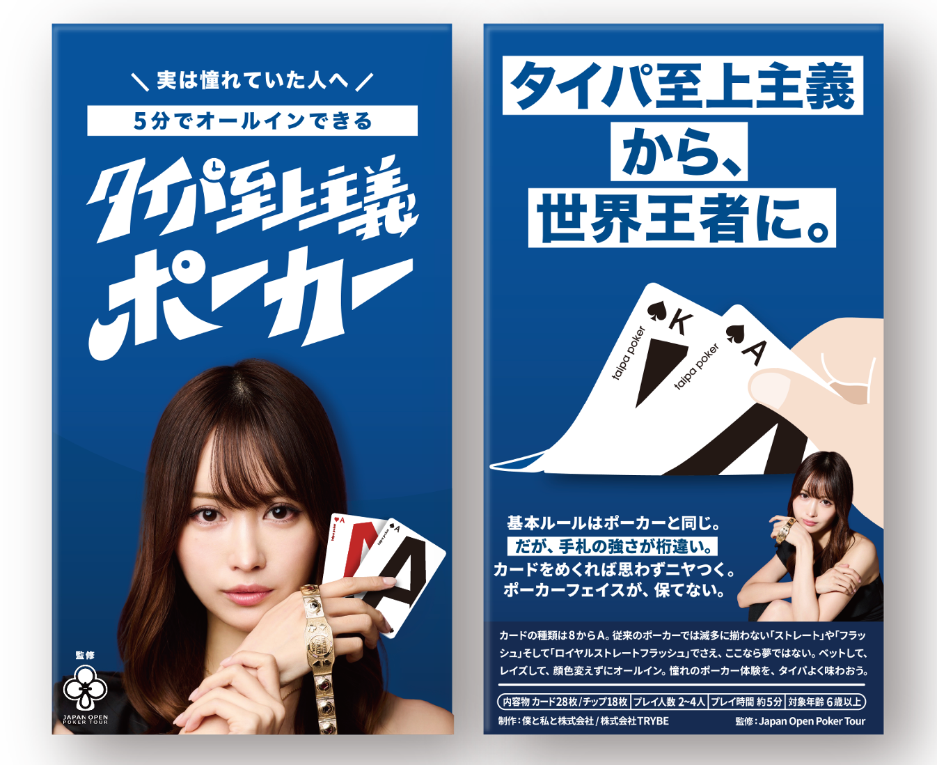 デジタルネイティブ世代向けのアナログゲームメーカー「TRYBE」は、Z世代向けの企画・エモマーケティング®を手がける「僕と私と株式会社」と共同開発したボードゲームブランド『タイパ至上主義®』シリーズの最新作『タイパ至上主義ポーカー』と、ポーカー世界王者・岡本詩菜のコラボパッケージを数量限定で販売いたします。
