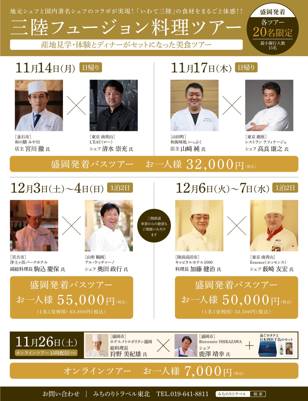 岩手県は、いわて三陸の「食」を楽しみ、体感できる「三陸フュージョン料理ツアー」を2022年11月から12月にかけて4回シリーズで開催します。